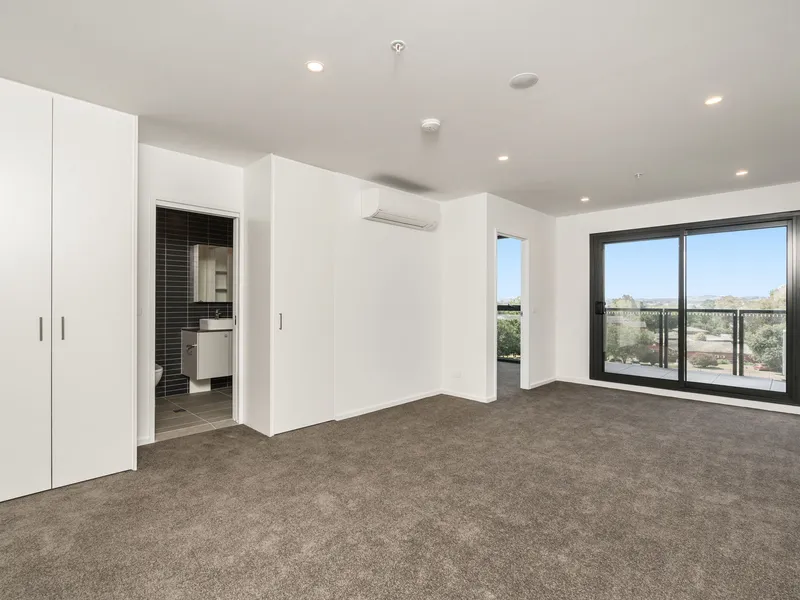 The main bedroom with floor to ceiling windows and peaceful views, has a generously sized walk through wardrobe to the dual access main bathroom.