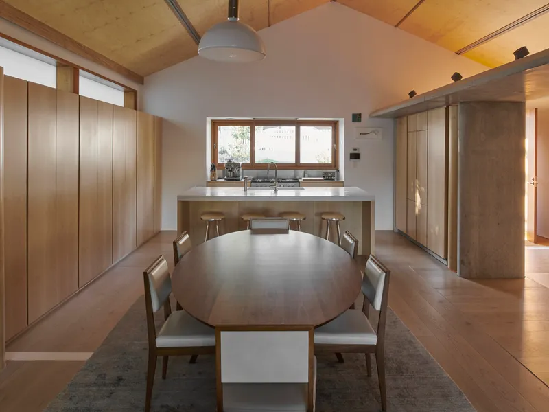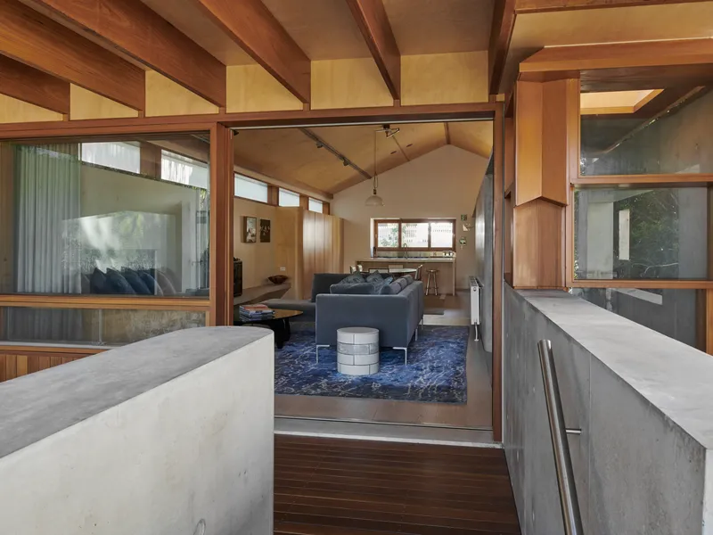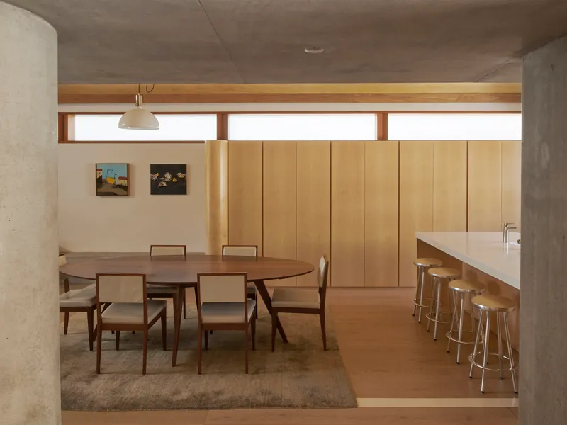 The sequence of spaces within has been meticulously designed, flooded with natural light invited in by the skylight and timber sliding doors. Considerations of light, material, and form were key in developing the interior, which is ordered by a central off-form concrete barrier.