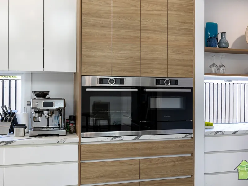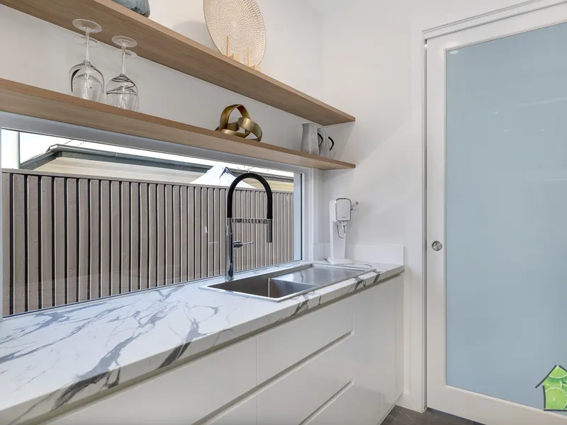• Gourmet kitchen with butler’s pantry, Bosch oven, combi microwave with warmer drawer, Miele dishwasher, and large island bench with servery window to the outdoor area