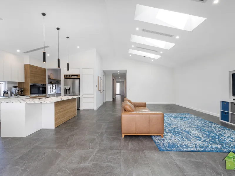 • Elegant open-plan lounge, dining, and kitchen with soaring ceilings and skylights (with optional blinds)