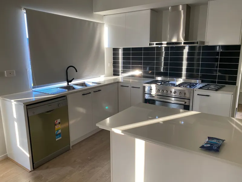 - Modern kitchen with stone island bench top and stainless steel appliances.