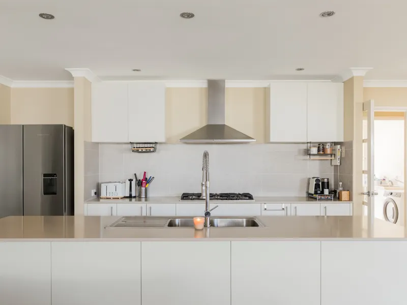 Modern kitchen with stone benchtops, 900mm gas cooktop, dishwasher, and walk-in pantry