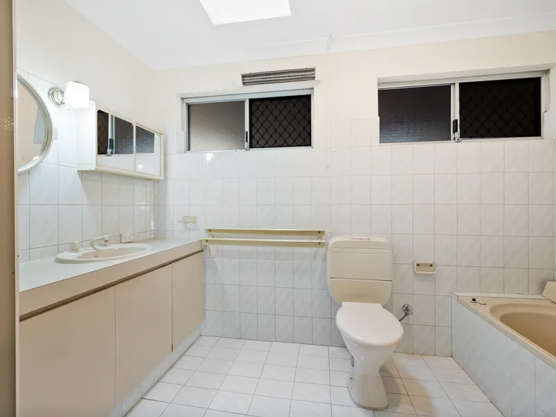 Spacious master bedroom off entry includes a walk in wardrobe with skylight for natural lighting an en-suite bathroom with separate shower and bath.