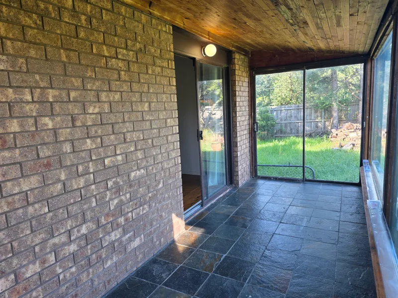 Enclosed sunroom overlooking a large backyard