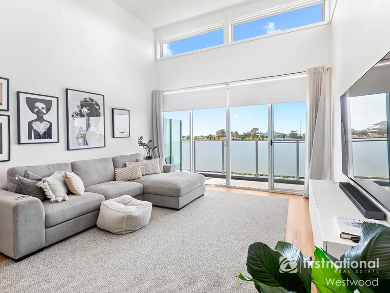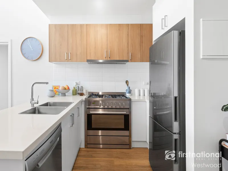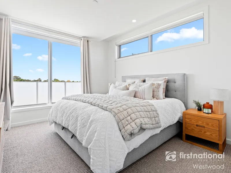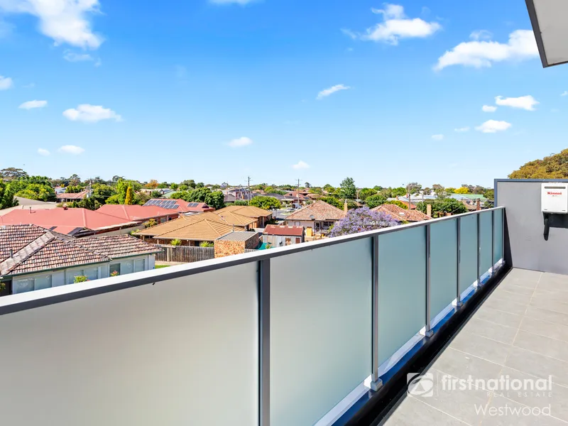 The apartment has a private balcony providing both space and a pleasant external outlook across the rooflines toward Werribee South, creating a home that immediately impresses upon inspection.