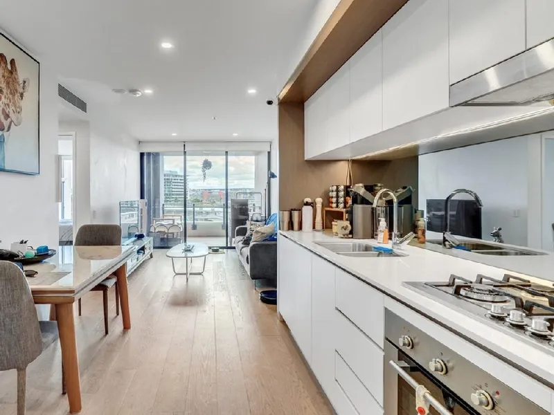The open-plan living and dining area is filled with natural light, flowing seamlessly to the balcony, while the modern kitchen is equipped with a new induction cooktop, pyrolytic oven, and a Fisher & Paykel double drawer dishwasher, perfect for a comfortable everyday living.
