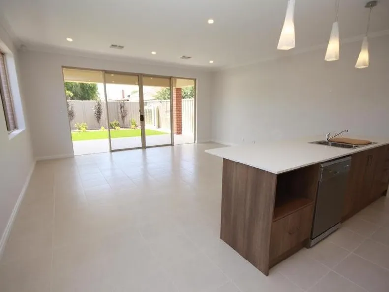At the heart of the home, the light-filled open plan living and dining area provides a welcoming space to relax or entertain. Beautifully tiled throughout, this central hub flows effortlessly into the contemporary kitchen, which is equipped with granite benchtops, quality stainless steel appliances, gas cooktop, dishwasher, and an abundance of storage — ideal for everyday living and entertaining alike.