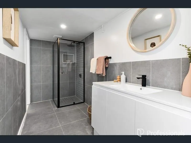 The spacious bathroom and laundry have been thoughtfully renovated with contemporary finishes, featuring a rainfall shower and enclosed toilet for added comfort and practicality. Split-system heating and cooling, along with electric panel heaters, ensure year-round comfort.