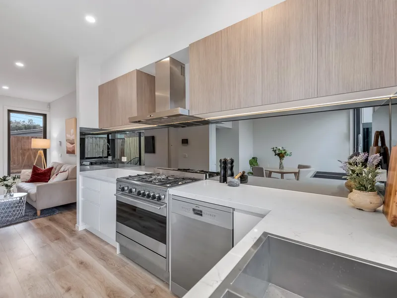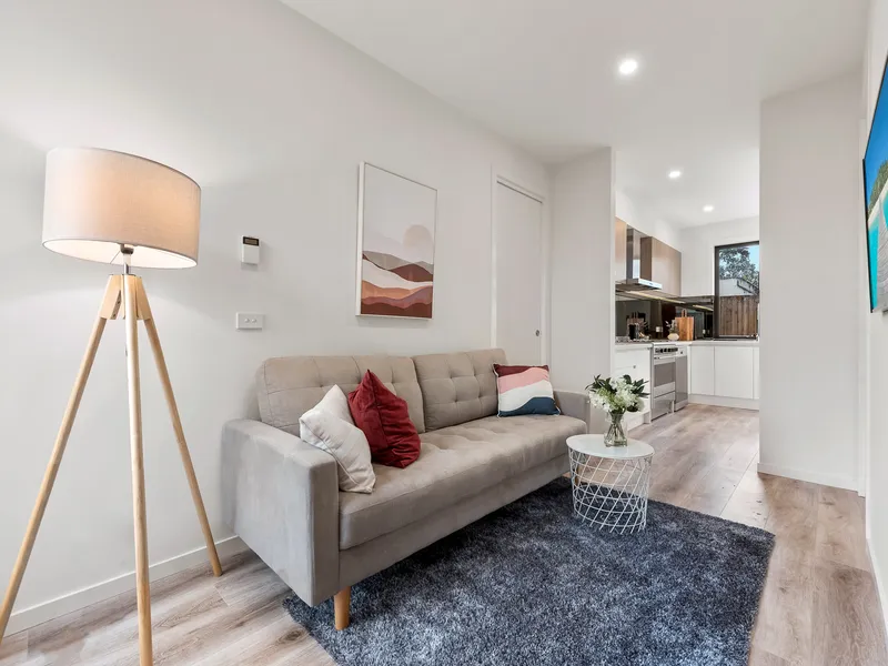 Step inside to be welcomed by an elegant arched entry hall that leads to two generous bedrooms, both comfortably carpeted and filled with natural light. The home flows through to a bright open-plan living, dining and kitchen area, where engineered timber floorboards complement a stylish timber-topped kitchen, creating a warm and inviting space for everyday living.