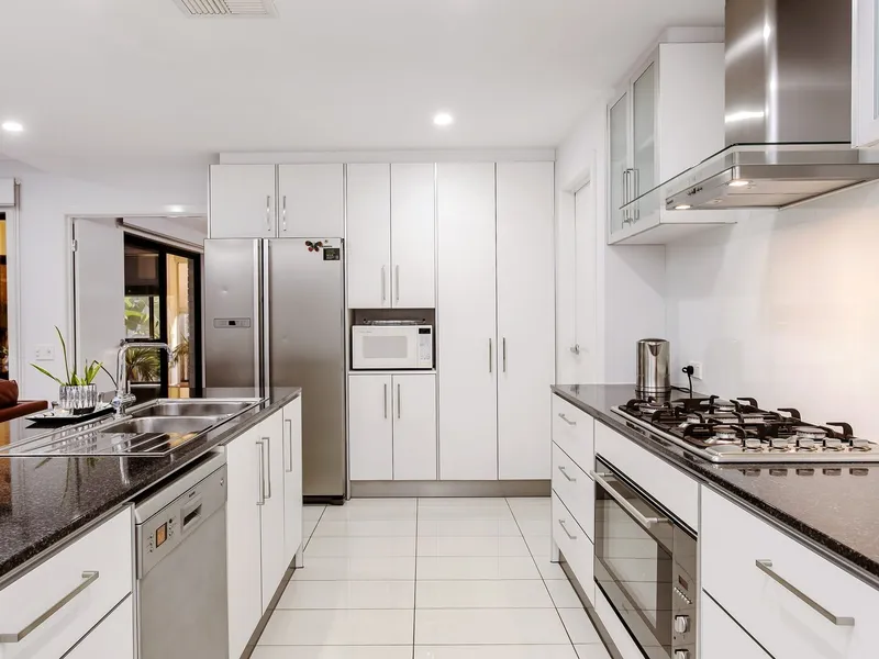 - Modern kitchen with stone benchtops, gas cooking, plenty of cupboards and walk in pantry