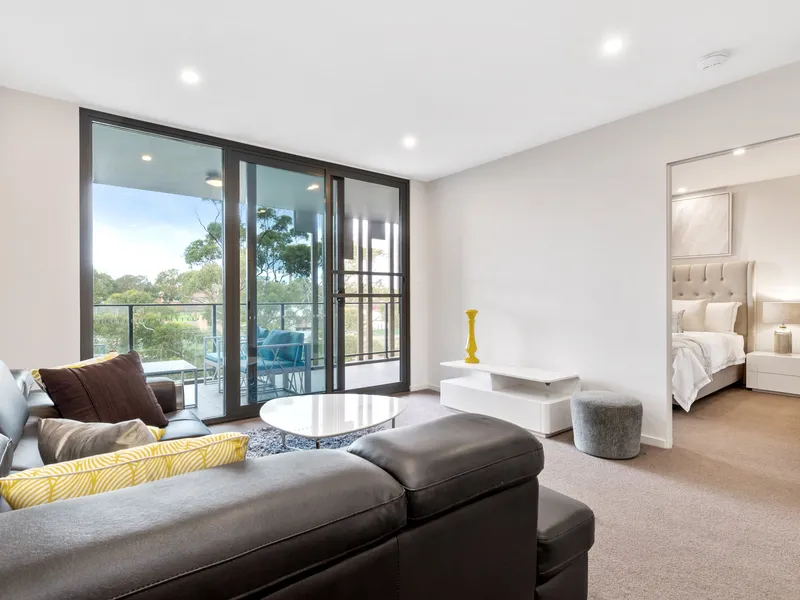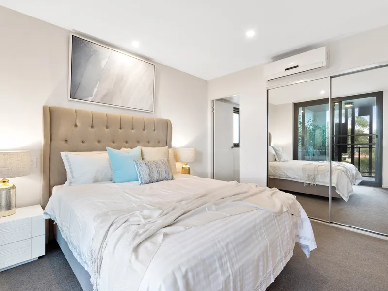 The contemporary kitchen features sleek stone benchtops and European appliances, flowing into the light-filled living and dining area that opens onto a generous balcony – perfect for relaxing or entertaining. The main bedroom offers built-in robes and direct balcony access, creating a private retreat. Reverse-cycle air conditioning ensures year-round comfort, while a secure car bay and private storeroom add practicality.
