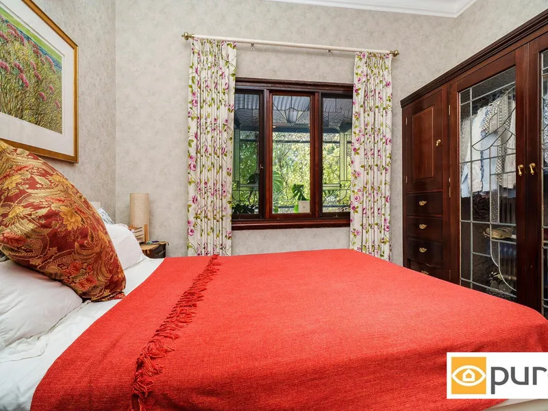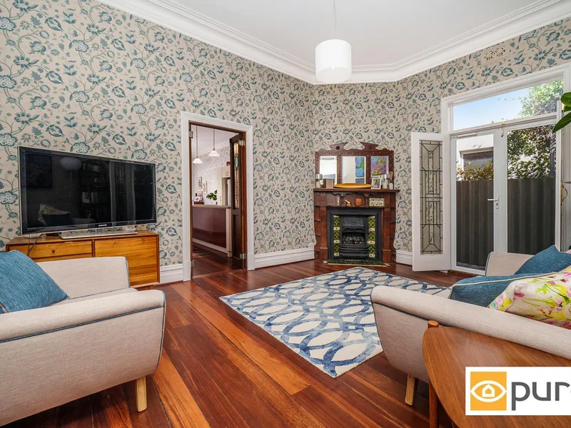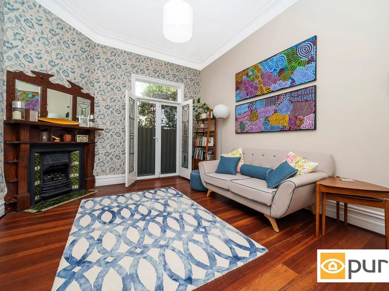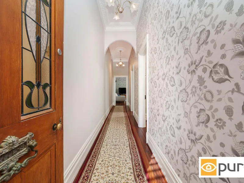 Step inside to a traditional hallway adorned with archways and ceiling roses, leading to two generously sized bedrooms complete with high ceilings, polished Jarrah floorboards, original ornamental tiled fireplaces and split-system air-conditioning. A formal living room sits at the end of the hall, enhanced by stunning leadlight French doors, while the rear of the home opens into a light-filled, renovated kitchen and dining space. The kitchen is well-appointed with stone benchtops, a central island and ample storage, complemented by a versatile study or loft space.