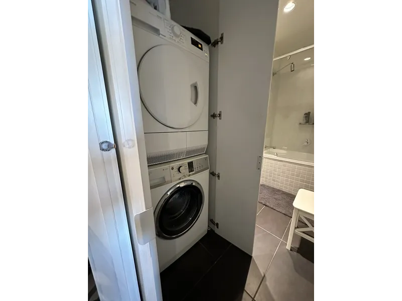 Showcasing abundant natural light and sweeping city skyline views, this stylish furnished apartment offers an exceptional blend of comfort and convenience. The contemporary galley kitchen is beautifully appointed with stone benchtops, integrated fridge joinery, a dishwasher, and a gas cooktop.
