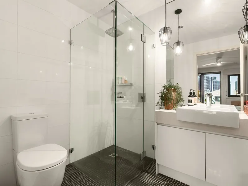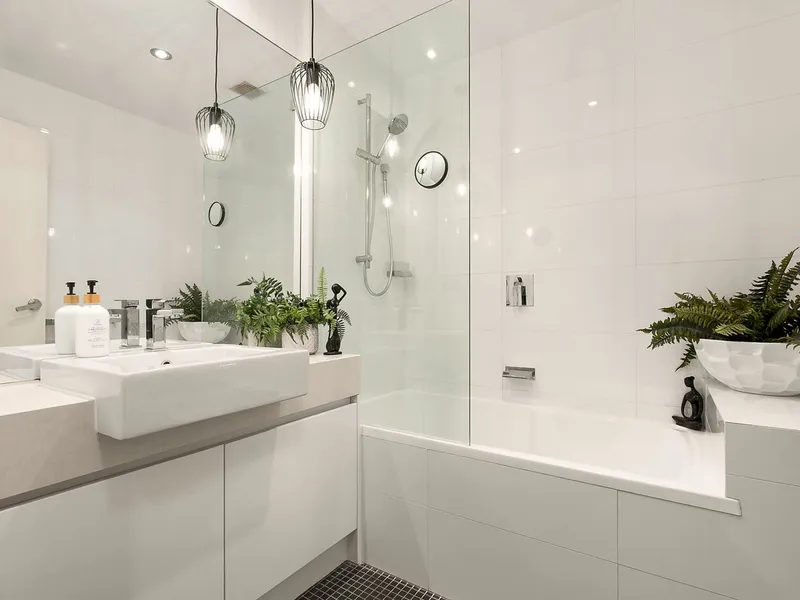 The light-filled interior features two generous bedrooms, including a larger master with built-in robes, serviced by a sleek ensuite and an equally impressive main bathroom. Both bathrooms are beautifully appointed with stone-top vanities and floor-to-ceiling tiles.