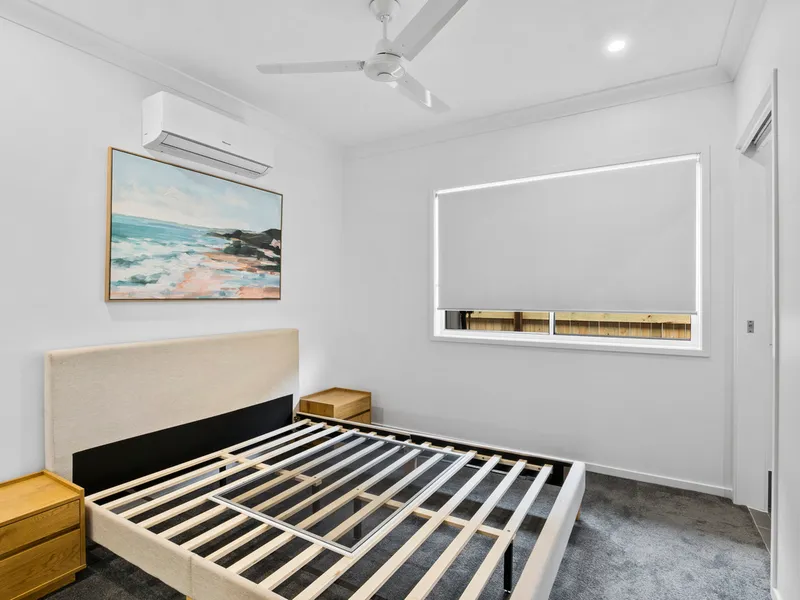 • Spacious furnished bedroom with queen bed (mattress not included), 2 bedside tables, wall-mounted TV, built-in wardrobes, air conditioning, and ceiling fan