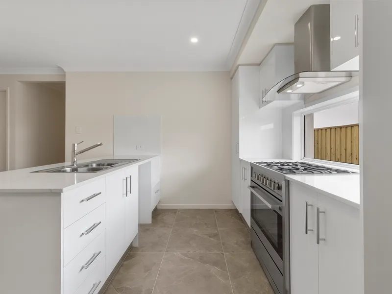 • Modern kitchen with gas cooktop, stone benchtops, and ample storage