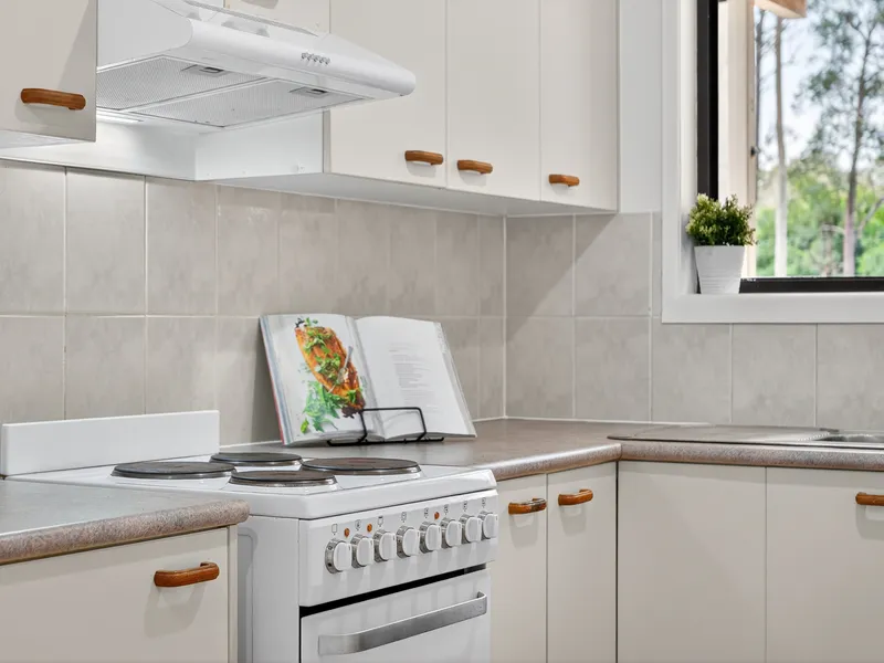 The kitchen flows seamlessly into the light-filled informal living and dining area, where glass sliding doors frame the picturesque view of the surrounding gardens.
