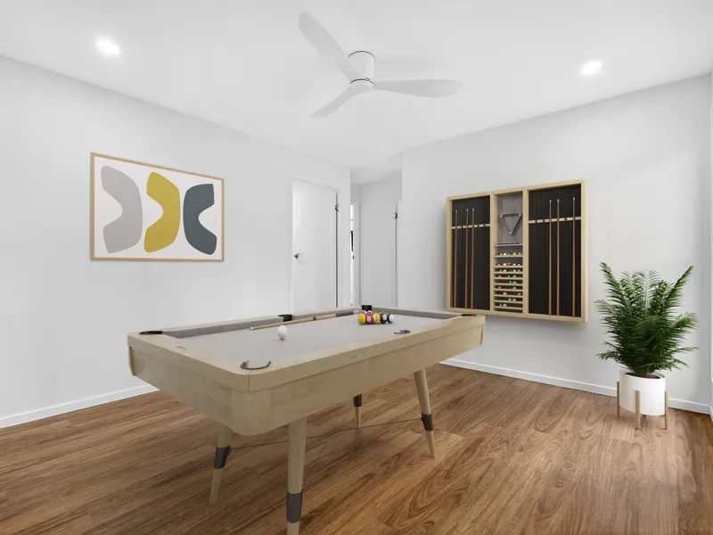 The home features two generously sized main bedrooms, positioned opposite the main bathroom and a separate powder room. At the end of the home, a rumpus room or children's play area leads to three other large bedrooms, each complete with built-in robes and ceiling fans, as well as a second bathroom.