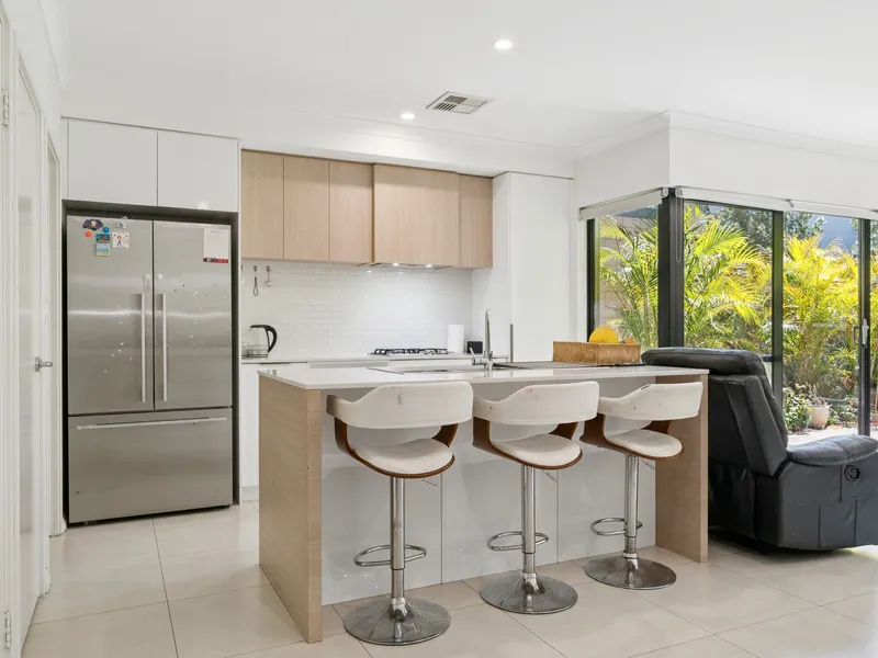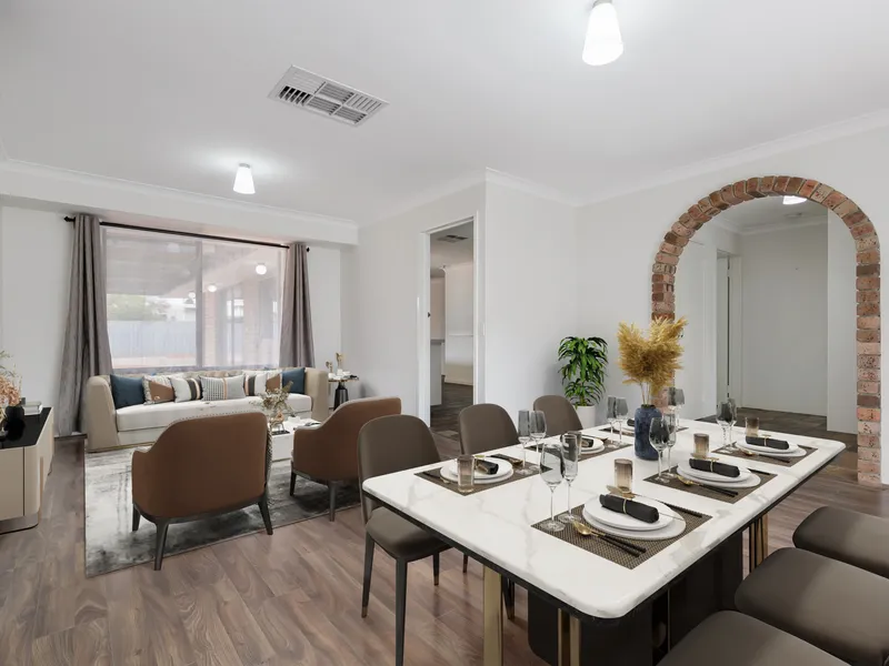 The main living area is open plan and offers a large, spacious kitchen, meals and family room, all overlooking the beautiful covered patio area with low maintenance paving areas, reticulated garden beds and large storage shed.