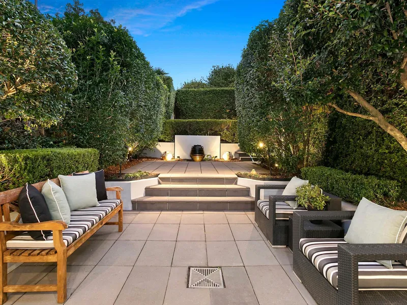 - Private terraced courtyard garden with decorative water feature