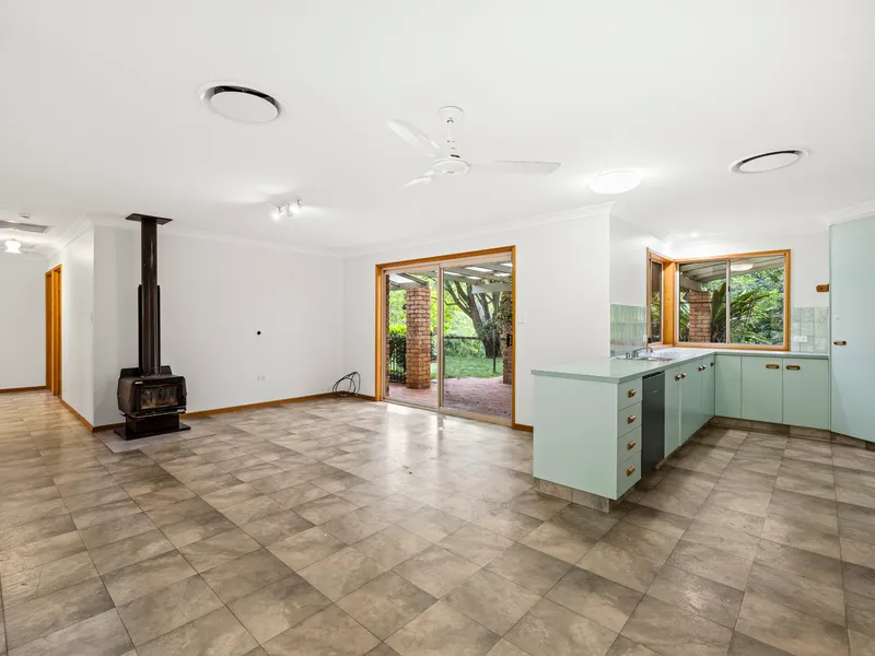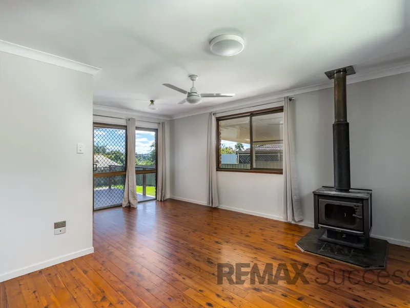 The home offers multiple living areas designed for everyday family living. A separate lounge room showcases polished timber floors, a ceiling fan and a wood heater, creating a warm and inviting space during the cooler months. An additional spacious family living area also features polished timber flooring and a ceiling fan, with glass sliding doors extending the space out to the rear timber deck.