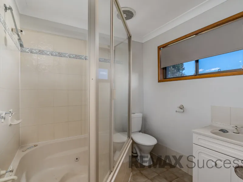 The main bathroom hosts both a separate shower and bathtub with vanity, while a separate toilet positioned off the hallway adds convenience for busy households. An internal laundry featuring washtub and auto taps further enhances practicality.