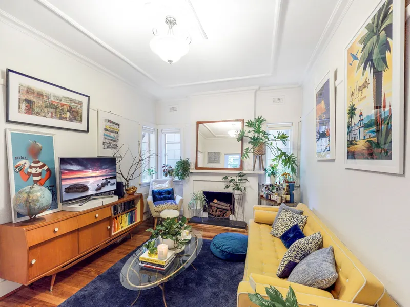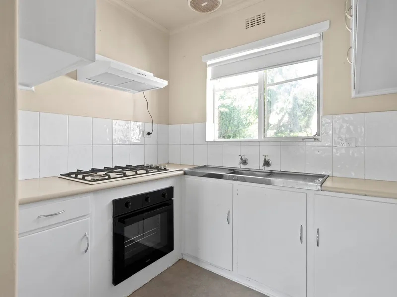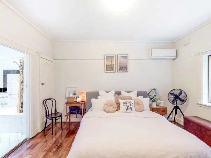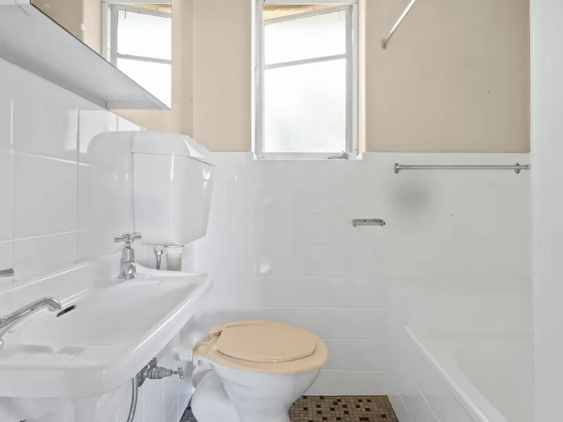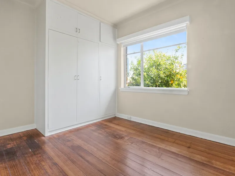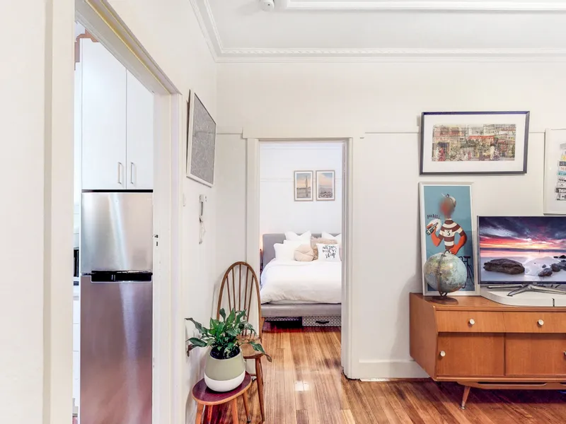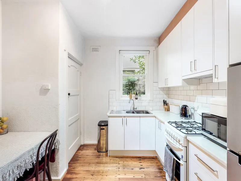 Inside, the apartment features two spacious bedrooms and a updated bathroom. A separate living room provides a comfortable space to relax, while polished timber floors throughout enhance the sense of light and space. The well-proportioned kitchen includes gas cooking and ample storage, making it both practical and functional.