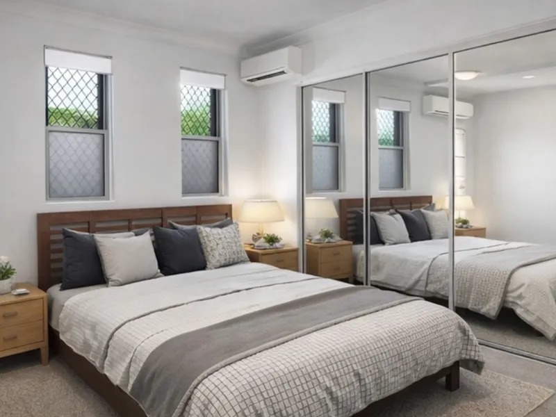 # Large second bedroom with built in wardrobes, SPLIT SYSTEM AIR-CONDITIONING and sliding doors leading onto balcony.
