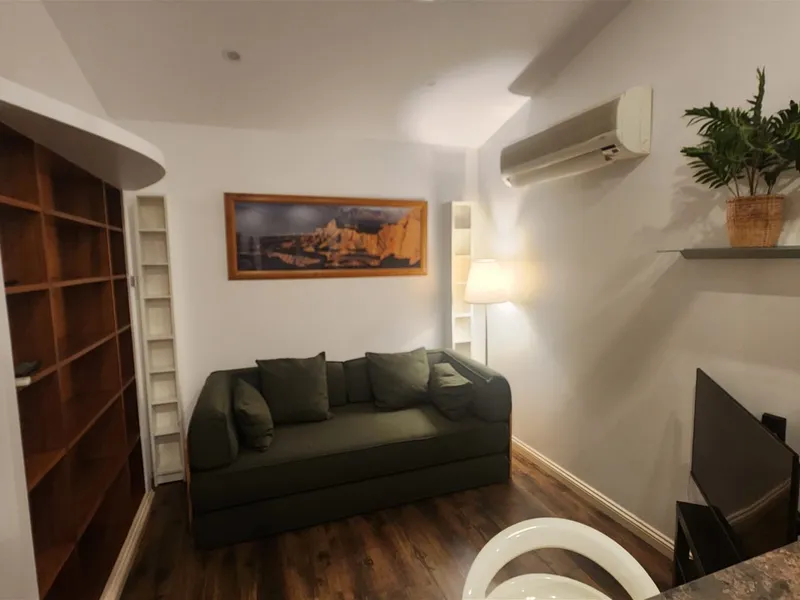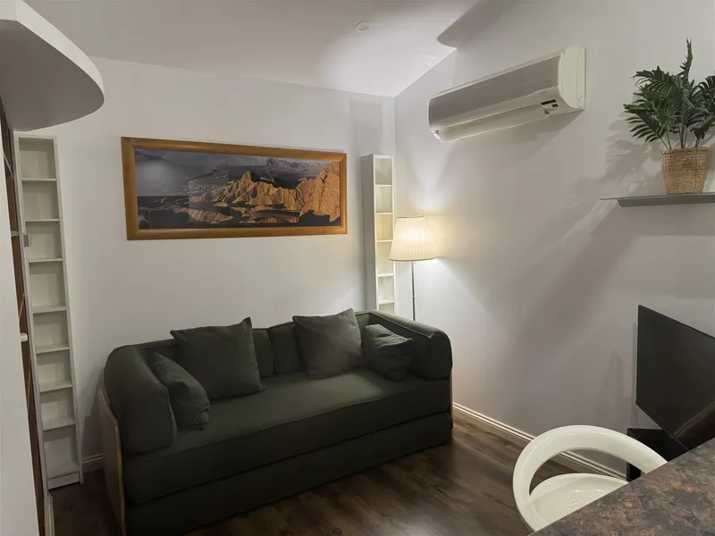 Inside, the flat features a comfortable living area, a separate bedroom, a sofa bed (doubles as a second bed), a fully equipped kitchen, and a private bathroom. Air-conditioning ensures year-round comfort, while the private outdoor space provides the perfect spot to relax.