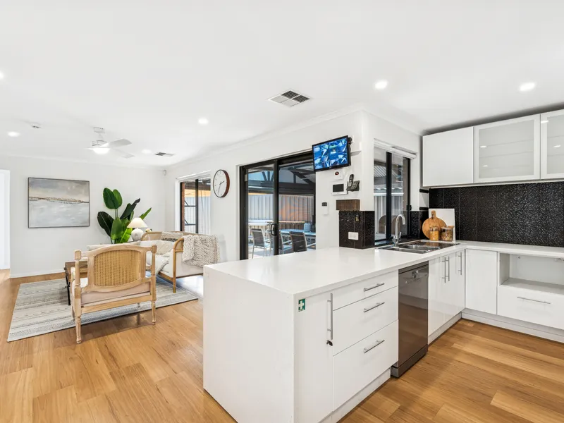 - Stunning modern kitchen boasting a breakfast bar, waterfall benchtop, cooktop, oven, stainless steel dishwasher, and ample cupboard and bench space