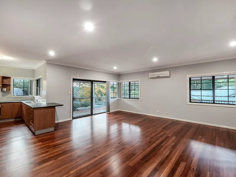 The living area is fitted with a split system air conditioner and a large ceiling fan for year-round comfort, while the main bedroom also includes its own split system. A covered front balcony provides a quiet spot to sit and unwind, and the grassed gardens are easy to maintain. There is plenty of off street parking for two vehicles.