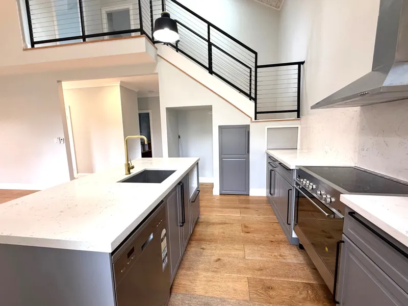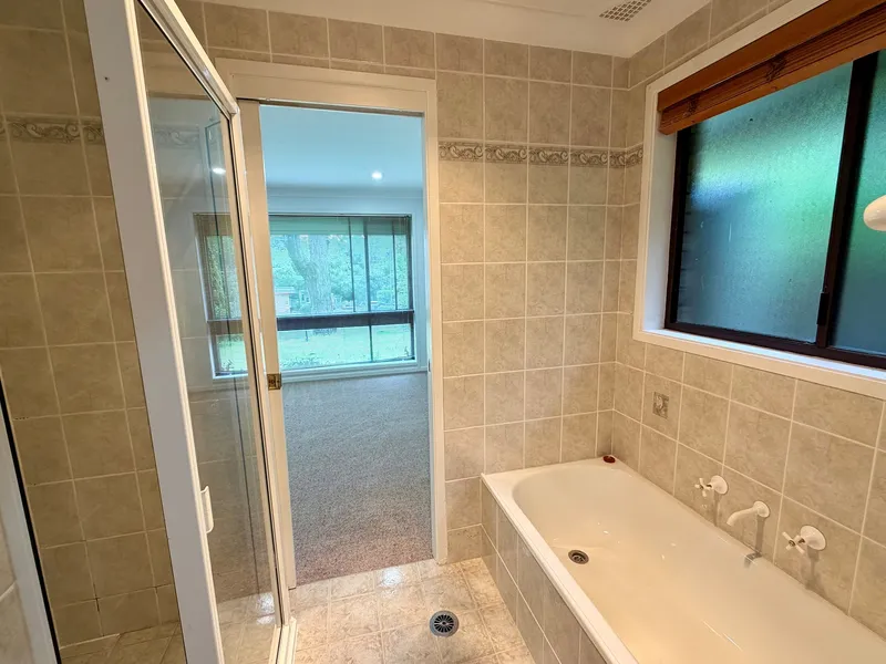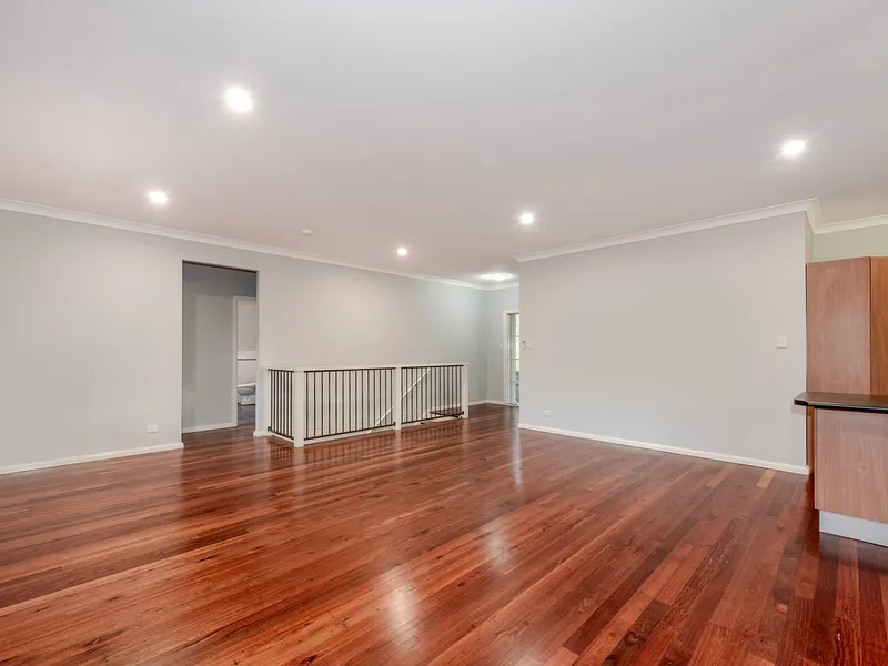 Each of the four bedrooms includes built-in robes and soft carpet, while timber flooring runs through the main living areas. The open plan kitchen and living area forms the heart of the home, creating an easy flow and a welcoming space to spend time in. The kitchen is a real highlight, thoughtfully finished with stone benchtops, a dishwasher, and plenty of room to cook and gather, making it as practical as it is inviting. The main bathroom includes a generous soaking tub as well as a separate shower, offering both comfort and functionality.