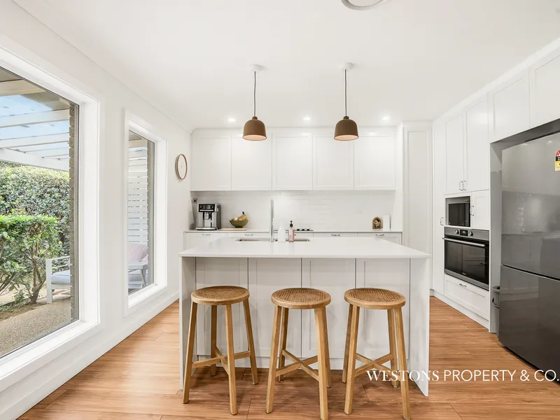 At the heart of the home is the beautifully renovated kitchen, thoughtfully appointed with a Caesarstone benchtop, breakfast bar and quality appliances including an oversized Westinghouse oven along with Fisher & Paykel cooktop and dishwasher.