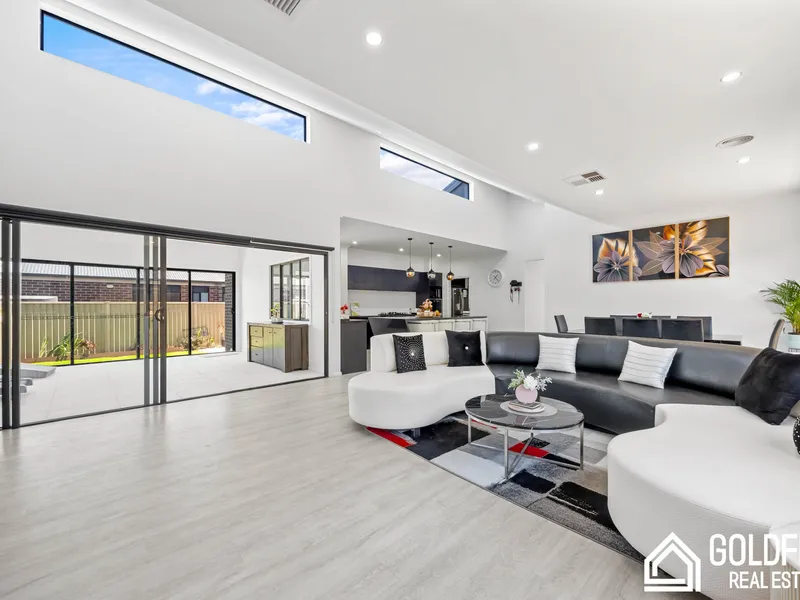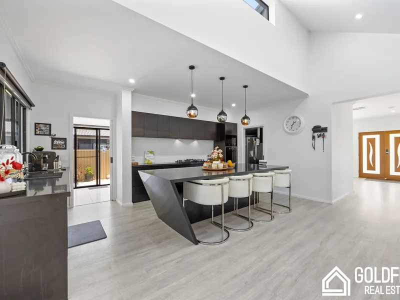 The open-plan designer kitchen is an entertainer’s dream, combining quality, class, and timeless elegance. It features a striking waterfall stone island bench with breakfast bar, premium appliances, and a well-appointed butler’s pantry with double sink and ample storage. Flowing seamlessly into the dining and expansive living area, this space is perfect for both family living and hosting guests.