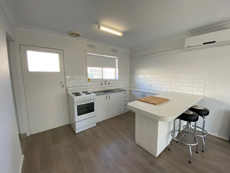 Featuring two well-appointed bedrooms with built-in robes, the home boasts a light-filled open plan kitchen, living and dining area designed for effortless everyday living. The contemporary kitchen is equipped with quality appliances and ample storage, while split system heating and cooling ensures year-round comfort.