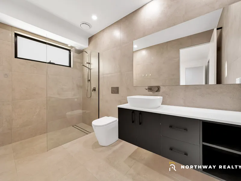 • 2 Modern Bathrooms: The main bathroom is designed for convenience, featuring a sleek, contemporary design with a bathtub and a shower, perfect for busy families.