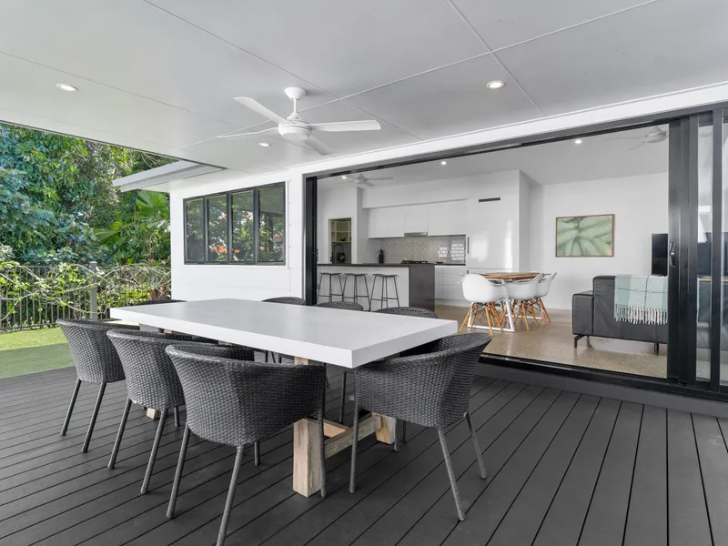 Tucked away in a peaceful setting just 150 metres from the shoreline and backing onto lush reserve, this architecturally designed pavilion home is all about relaxed tropical living. Multiple pavilions are linked by a breezy, decked walkway, with landscaped gardens and a calming water feature creating your own private sanctuary.