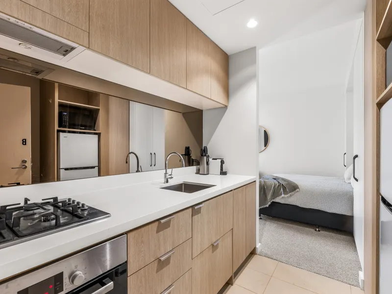 This stylish studio features a sleek open-plan layout ideal for solo travellers or couples. A queen bed sits beneath floor-to-ceiling glass doors that open to a private balcony, with blackout blinds and soft lighting creating a cosy atmosphere. The compact kitchen includes a gas oven, stovetop, microwave, coffee machine, and essential cookware.
