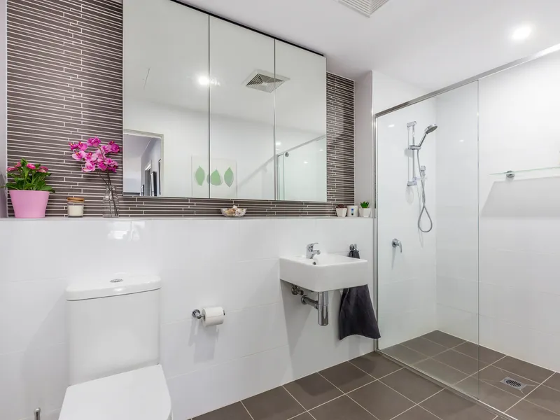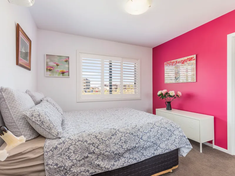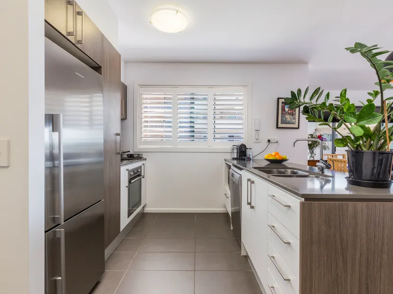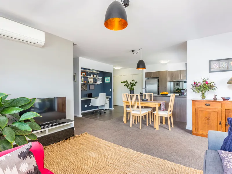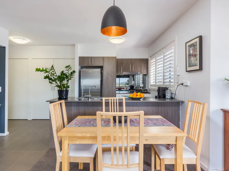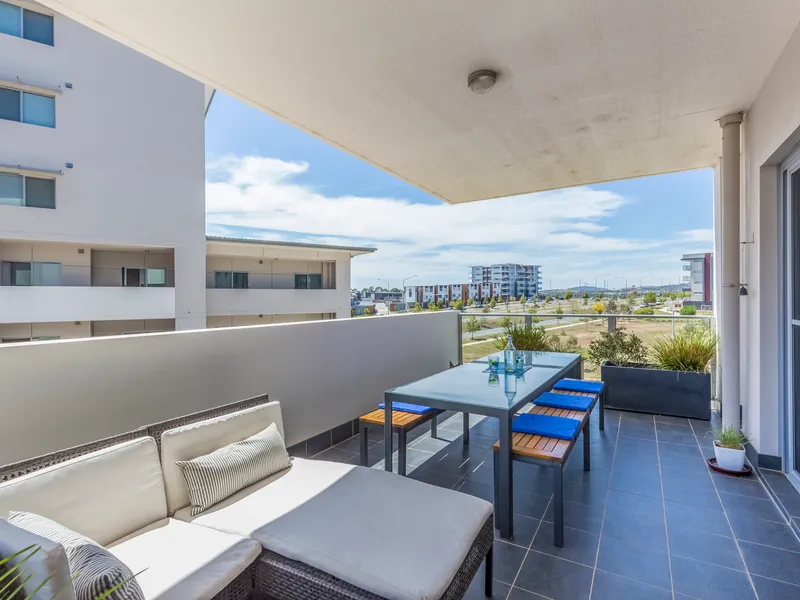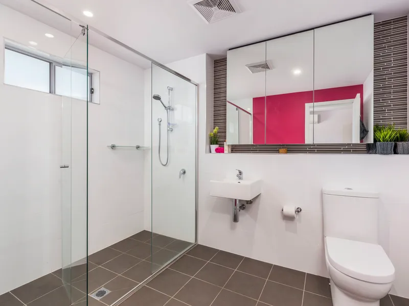 The broad, wrap around balcony is inviting and perfect for al-fresco entertaining, while enjoying a calming and leafy outlook to nearby parkland with children's playground, as well as the community gardens.