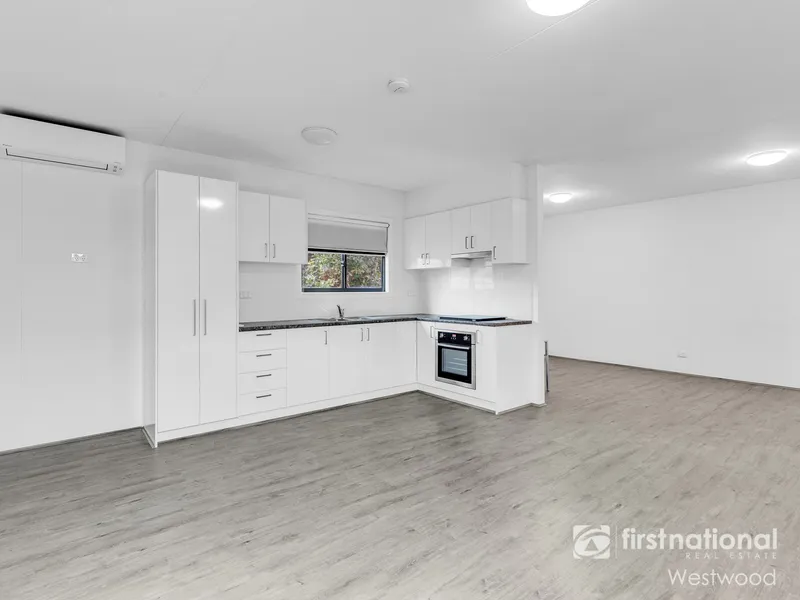 The private self-contained bungalow features a modern kitchen with plenty of storage, one bedroom, open plan kitchen/meals/living area, ensuite and split system heating/cooling.