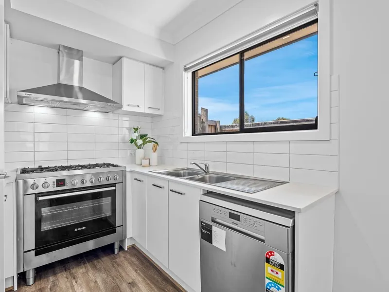 A light-filled open-plan living and dining area forms the heart of the home, complemented by a modern kitchen equipped with Omega stainless steel appliances, including a 900mm oven and cooktop, rangehood, dishwasher, and stylish subway tile splashback. Split-system heating and cooling in the main living zone and ducted heating throughout ensure year-round comfort.