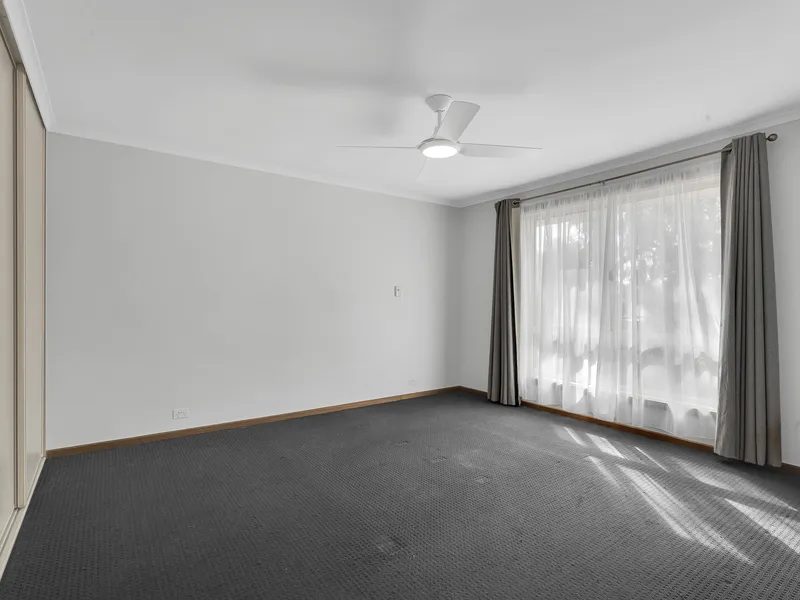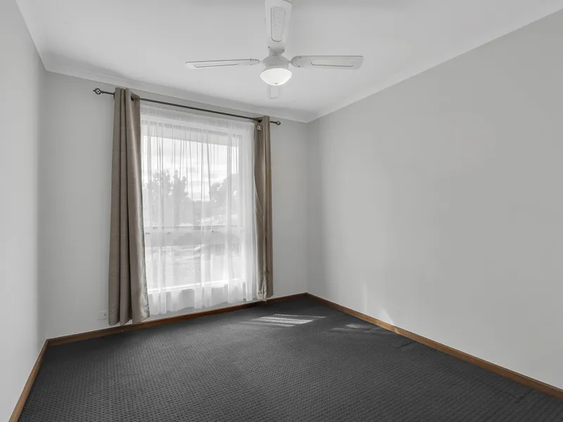 The home offers three comfortable bedrooms, all complete with ceiling fans for added comfort, with one bedroom also featuring a built-in robe for convenient storage. A central bathroom services the home and includes both a shower and a family-friendly bath, while a separate toilet adds extra practicality for busy households.
