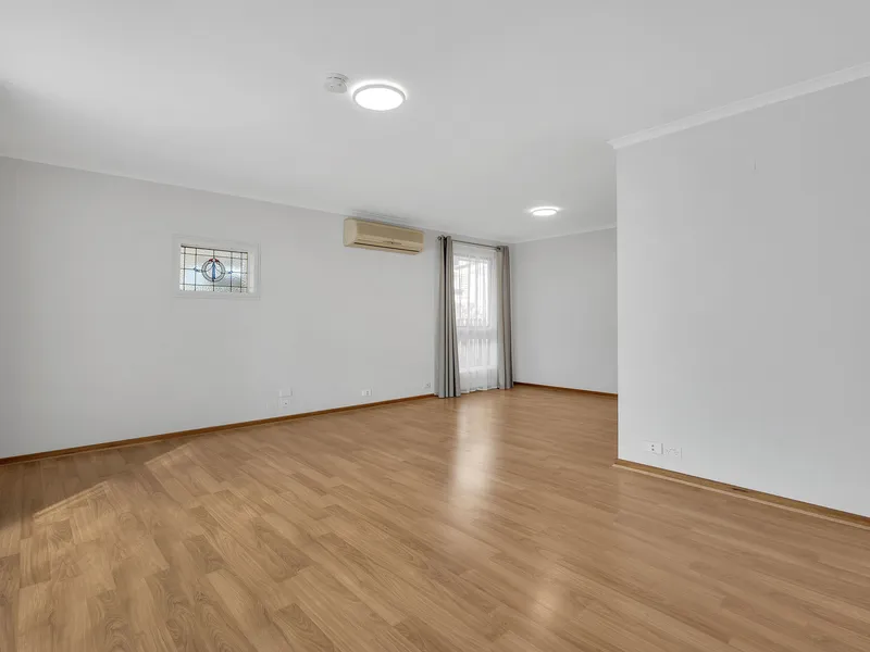 A spacious living room sits at the heart of the home, featuring a large picture window that fills the space with natural light and a split system air conditioner to ensure year-round comfort. The generous layout provides plenty of room for both everyday living and entertaining.