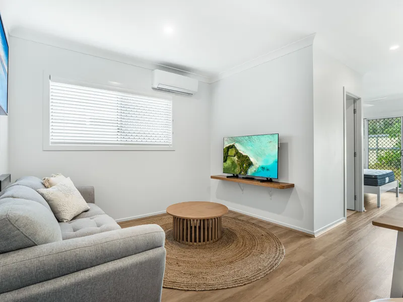 FULLY FURNISHED: Bed, lounge, dining setting, outdoor setting, smart TV, window furnishings.