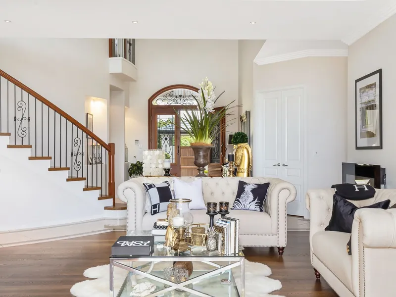 From the moment you arrive, the home makes a statement. A sweeping driveway and manicured grounds set the tone before you step through the impressive entry foyer, where soaring ceilings and natural light create an immediate sense of space and sophistication.