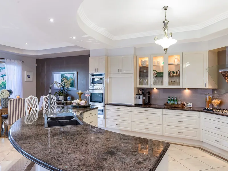 Multiple living zones flow effortlessly across the lower level, offering formal and informal areas designed for both everyday comfort and large-scale entertaining. The heart of the home is the expansive gourmet kitchen, complete with stone benchtops, quality appliances, generous storage and seamless connection to dining and family areas, all overlooking the lush grounds beyond.