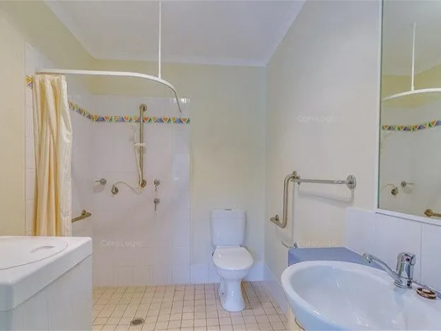 The bathroom is a walk in shower with no steps and is equipped with hand rails for assistance.