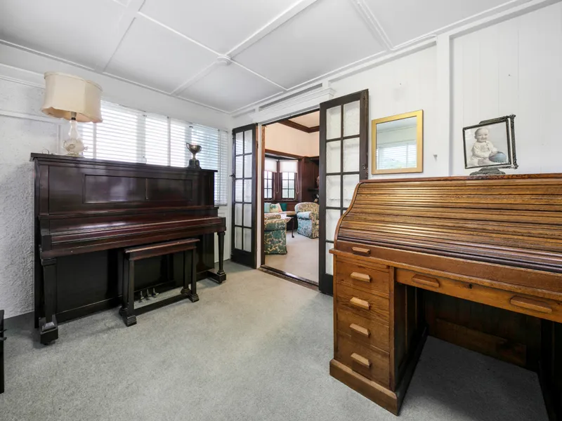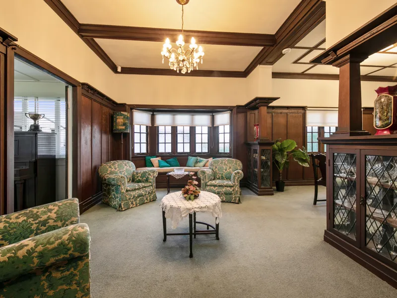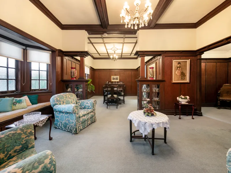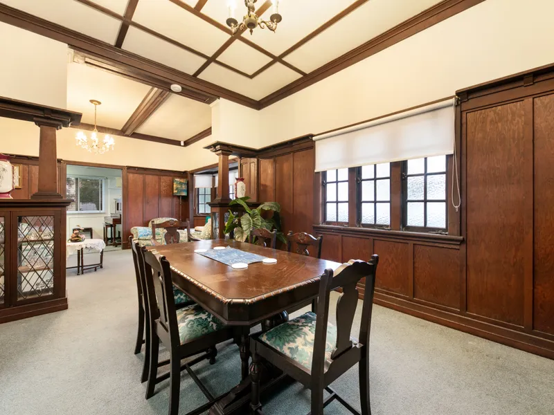 Boasting timeless style, warmth and character, the spacious living areas comprise a sunroom, lounge and dining area adorned with rich timber panelling, leadlight glass, coffered ceilings, chandeliers and traditional picture rails. The functional kitchen has been updated for easy meal preparation and includes a casual dining space and air-conditioning.
