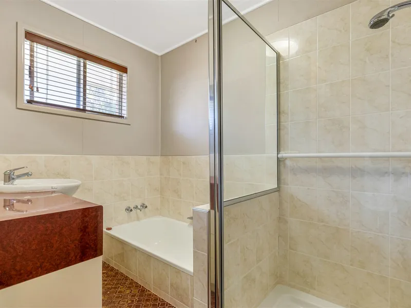 There are polished hardwood timber floors throughout. The main bathroom is tiled and has a bathtub, separate clear glass shower recess, large vanity with plenty of cupboard space and a large mirror above the vanity. The toilet is separate.