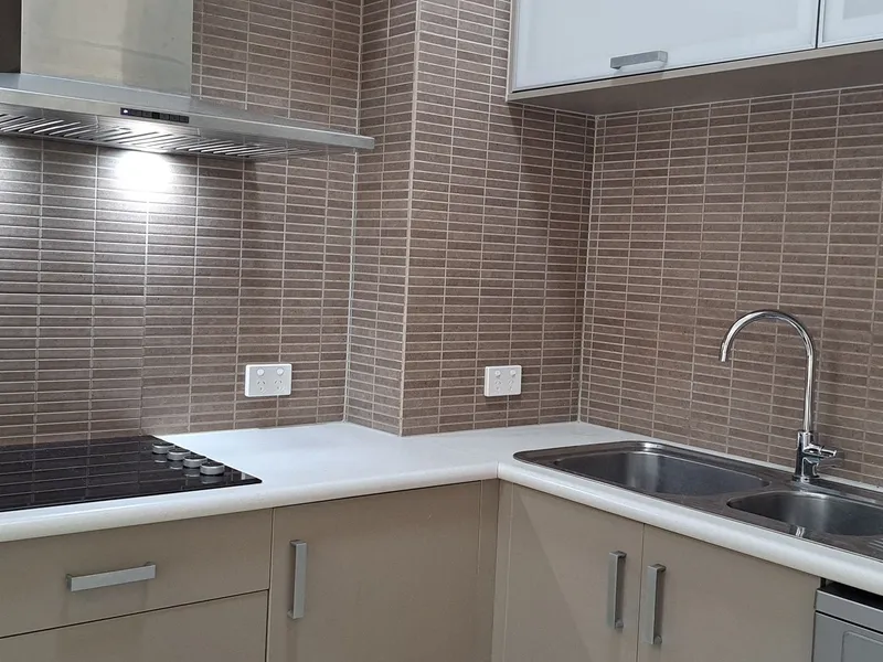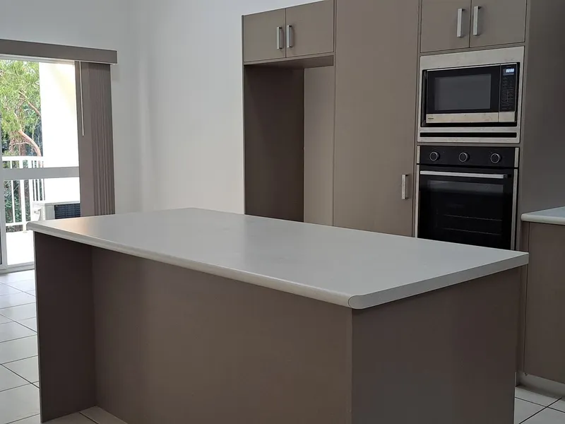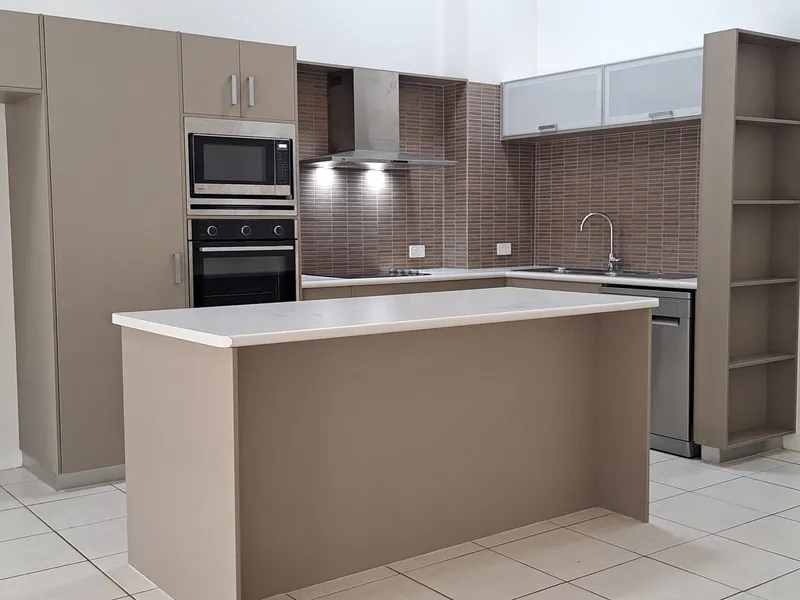 - Modern kitchen with: island bench, dishwasher, overhead cupboards and pantry